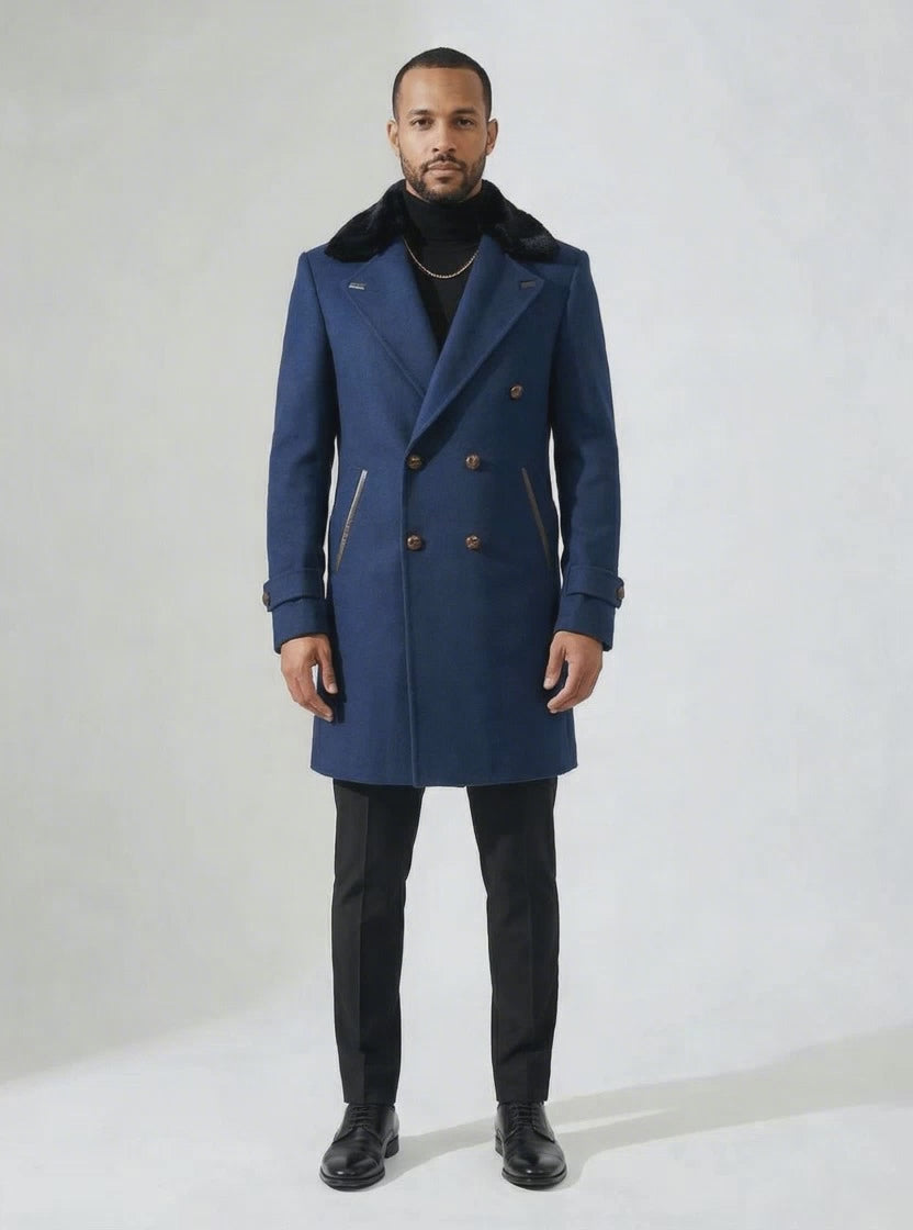 Australian Wool Double-Breasted Long Jacket Royal Blue with Fur Collar & Super 180 Wool Pants