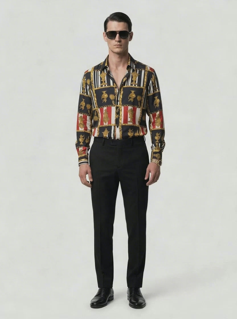 A refined statement of modern luxury, this ensemble seamlessly blends ornate detailing with impeccable tailoring. Designed for elevated occasions, it pairs a richly textured silk shirt with expertly crafted wool trousers for a look that is both sophisticated and contemporary.