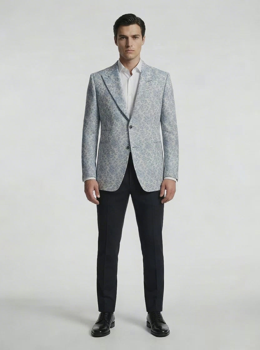 The silk jamawar texture jacket delivers an elegant sheen and intricate pattern, adding depth and luxury to the outfit. The poplin cotton shirt provides a clean and polished foundation, while the Italian Super 180s wool pants offer a structured, smooth finish that balances the richness of the jacket.